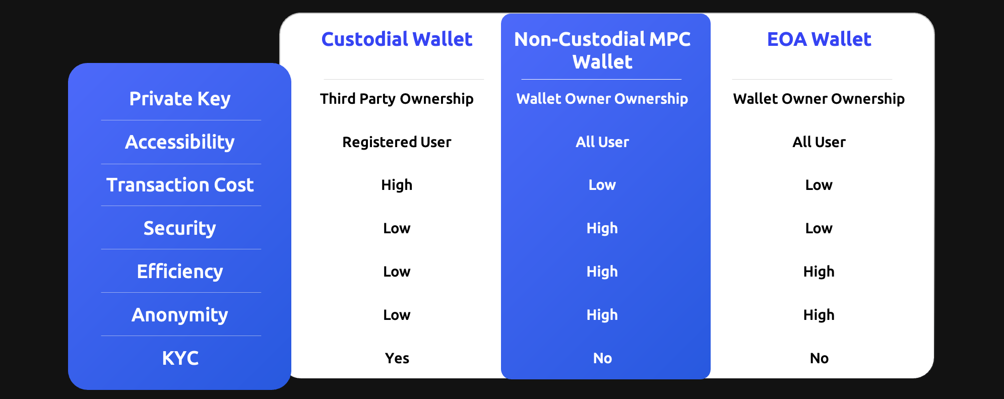 Explore how our state-of-the-art Non-Custodial MPC Wallet outperforms traditional models. Through leveraging Multi-Party Computation (MPC) and advanced multi-signature protocols, we've redefined the balance between security, efficiency, and user autonomy in the blockchain realm. See for yourself how our innovative approach translates to tangible benefits.